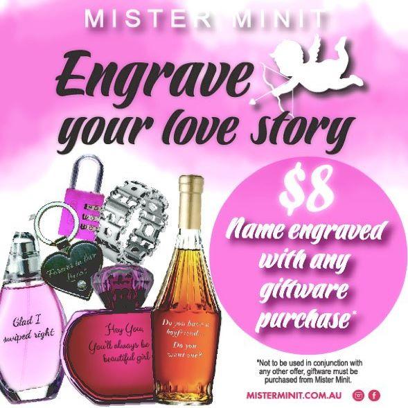 Mister minit mister minit specialises in the services of shoe repairs, key cutting and duplication, engraving and watch service. You may have to head in store and show our team exactly what you're after. Established in 1957, the mister minit team continue to build a strong service brand through commitment to excellence in customer service and continual improvements in relation to our customers changing needs. Thanks for contacting mister minit :) engraving is $12.95 for the first 5 characters, then $4.00 for each additional 5 characters thereafter. Customize any of our unique gifts with our online tool.